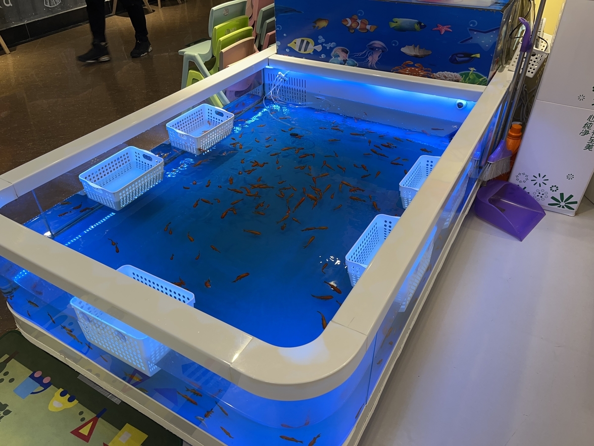 入口左側には大きな水槽があり、金魚すくいできます。ポイではなく網ですくうので破れないですが、それでも金魚逃げるし難しいです。(それでも上手にすくえるようになってた息子すごい!←親バカw)
