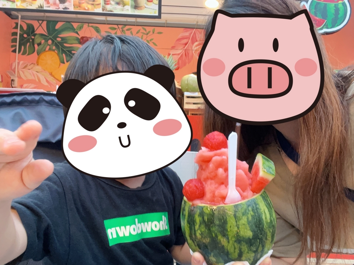 小さいスイカの中身をくりぬいてスムージーを入れてる、なんとも「映え」なドリンク!そして映えるだけでなく、味も甘くてめちゃくちゃ美味しい!スイカのスムージーってたまに水っぽいのとかあって当たりはずれあるけど、この店のは今まで飲んだスイカスムージーの中で一番おいしいかも!息子も「美味しい」って言っていっぱい飲んでた!