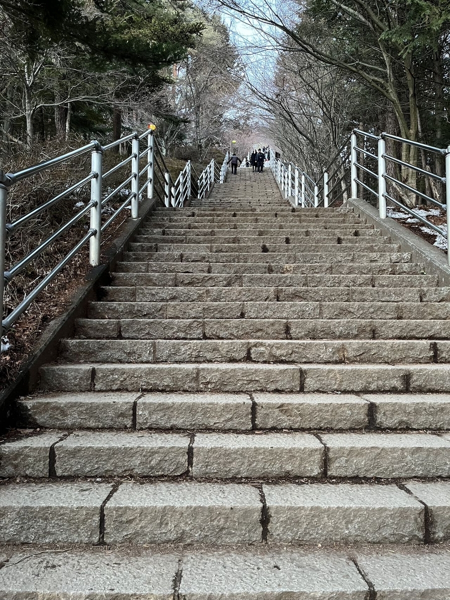 あまりにも段数が多いので、全部で何段あるのか数えながら歩くと398段でした。