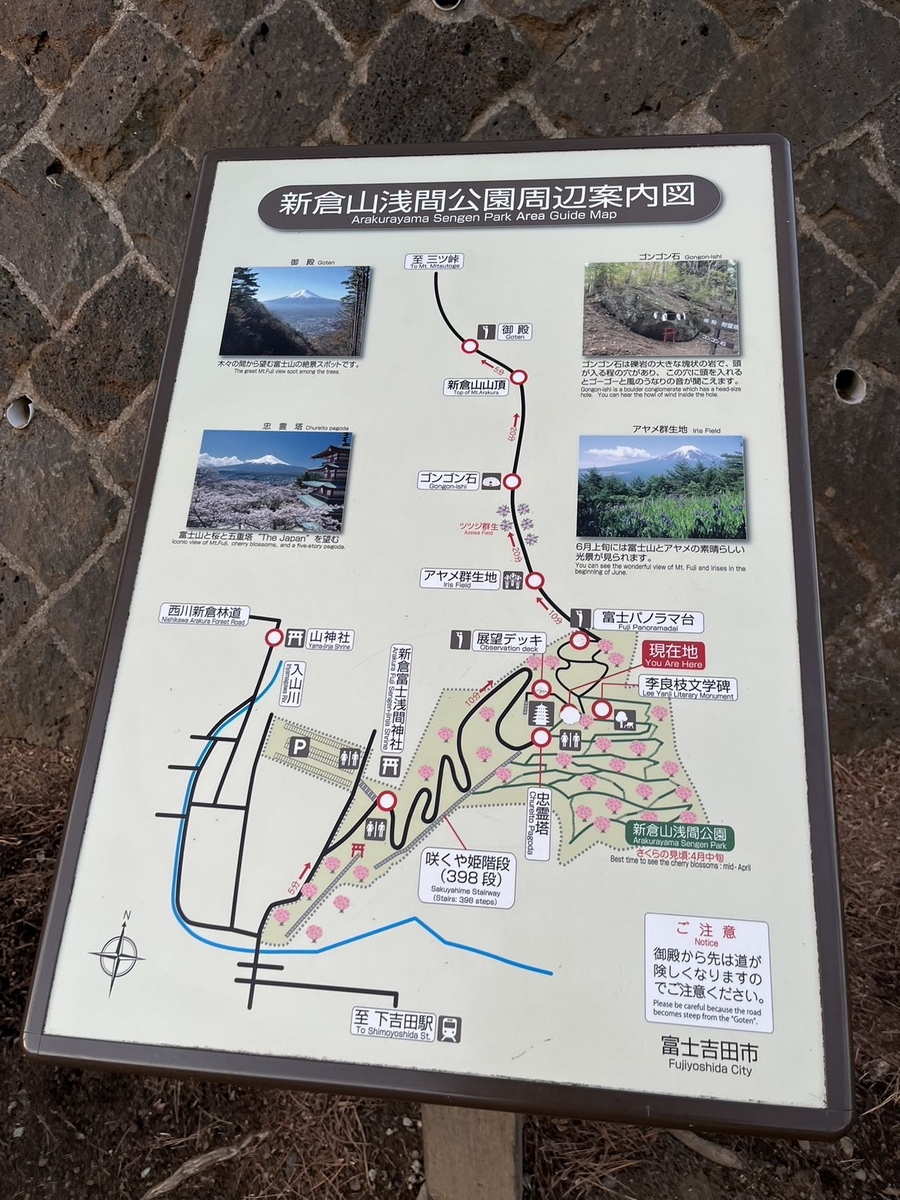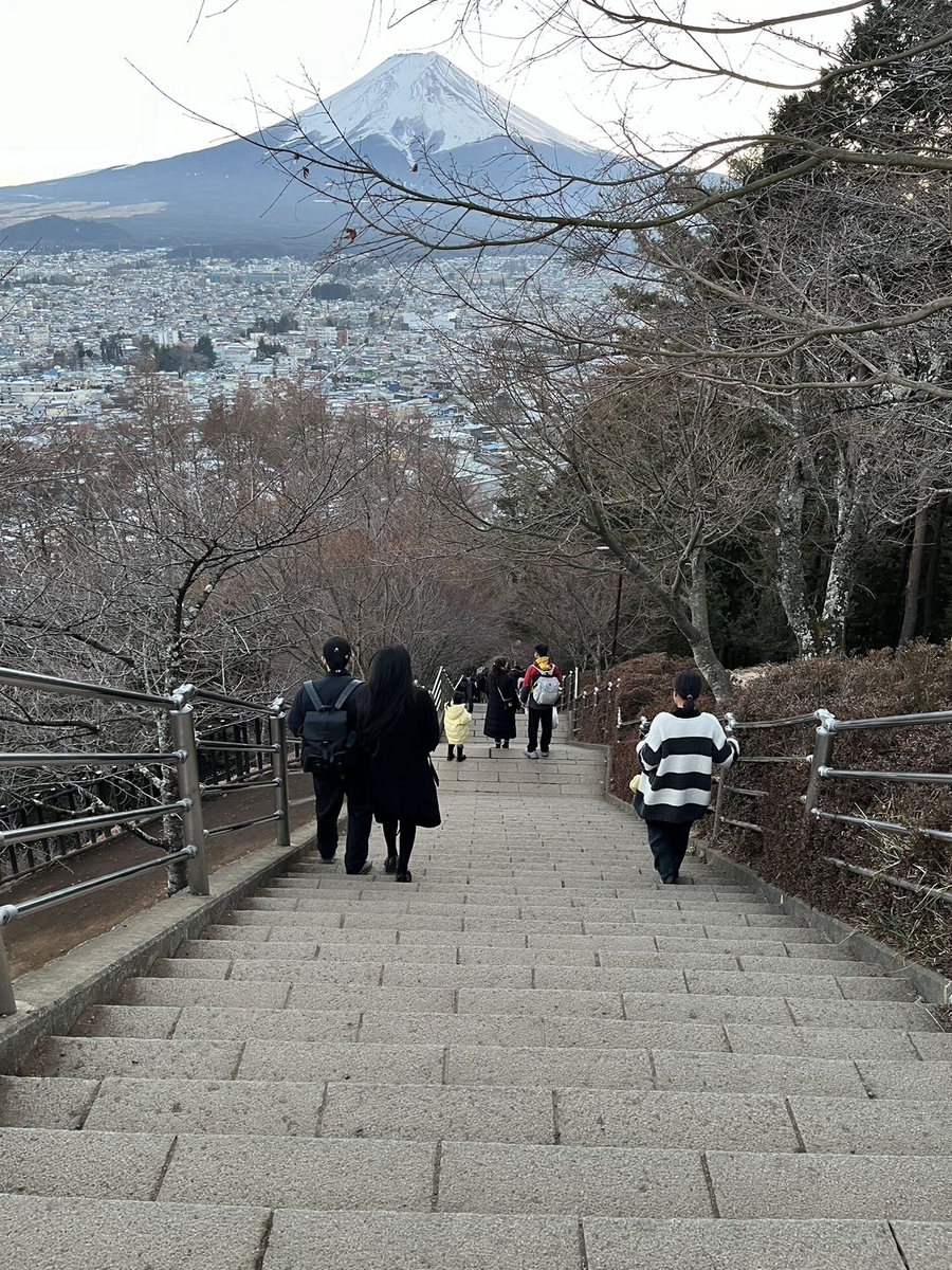 ホテルにチェックインした後、少しどこかで観光しようということになり、前々から行ってみたかった新倉山浅間公園が近くにあるみたいだったので「行きたい!」と提案し、行くことにしました。(2024年2月に行った時の情報です。)