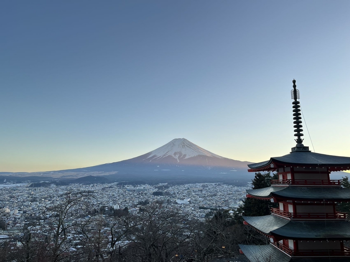 春の、富士山と五重の塔と桜が一緒に見える景色が有名なので、桜がないと物足りないのかなと思ってたけど、冬景色もこれはこれで綺麗!